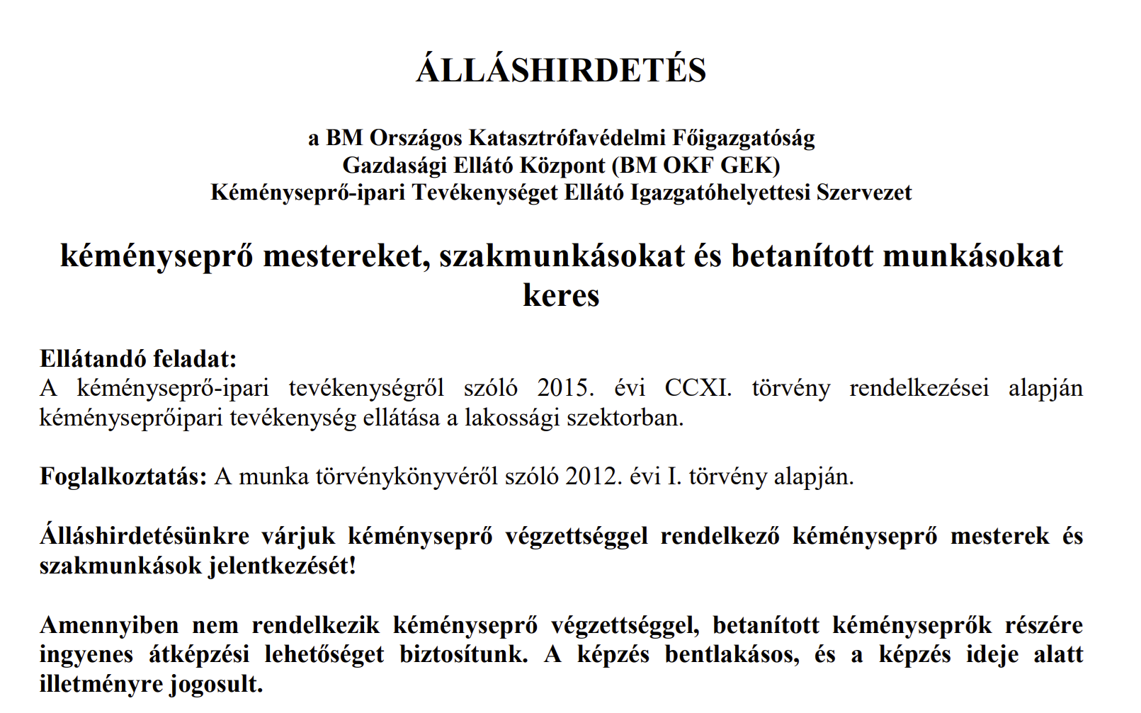 ÁLLÁSHIRDETÉS a BM Országos Katasztrófavédelmi Főigazgatóság Gazdasági Ellátó Központ (BM OKF GEK) Kéményseprő-ipari Tevékenységet Ellátó Igazgatóhelyettesi Szervezet kéményseprő mestereket, szakmunkásokat és betanított munkásokat keres.